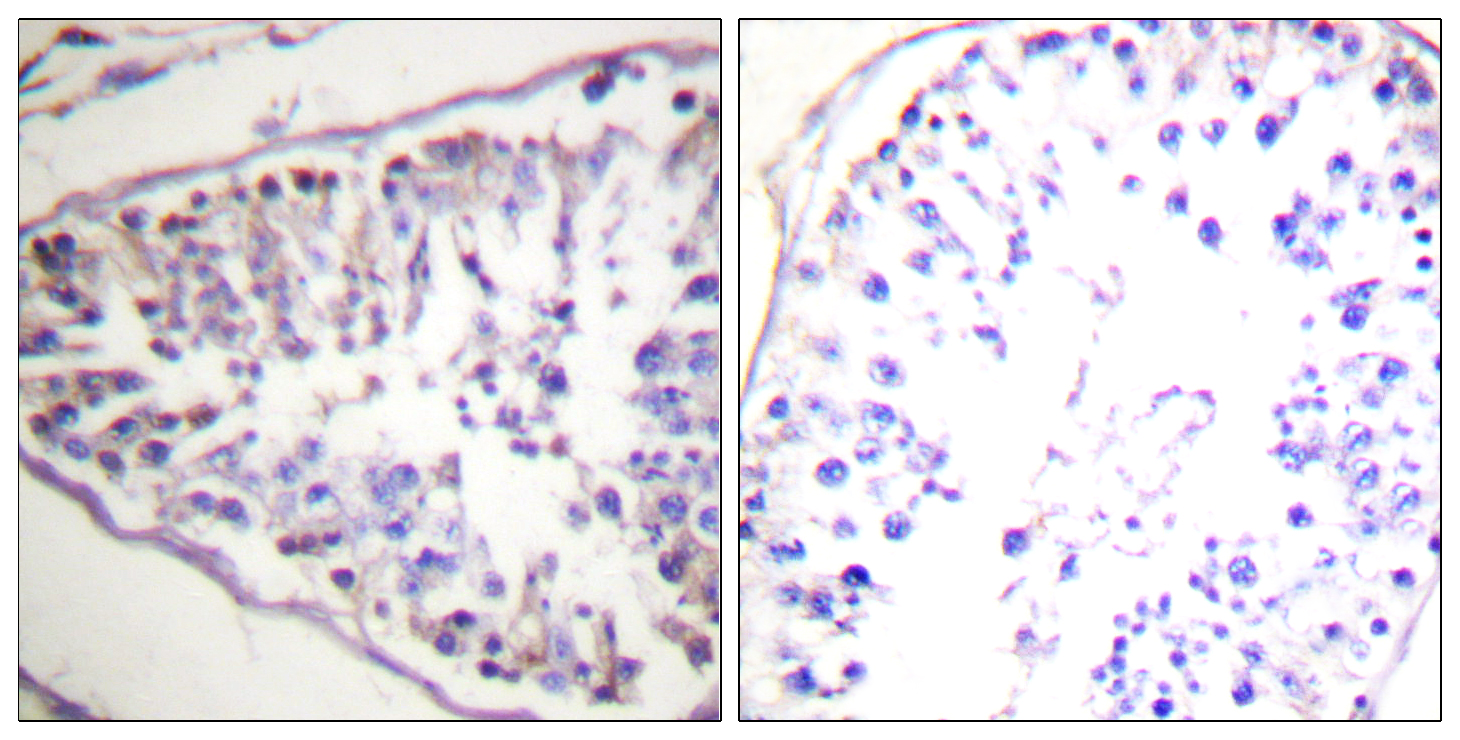 Immunohistochemistry analysis of paraffin-embedded Human tonsil tissue, using HSL antibody.High-pressure and temperature Sodium Citrate pH 6.0 was used for antigen retrieval. Sample with blocking peptide on the right.