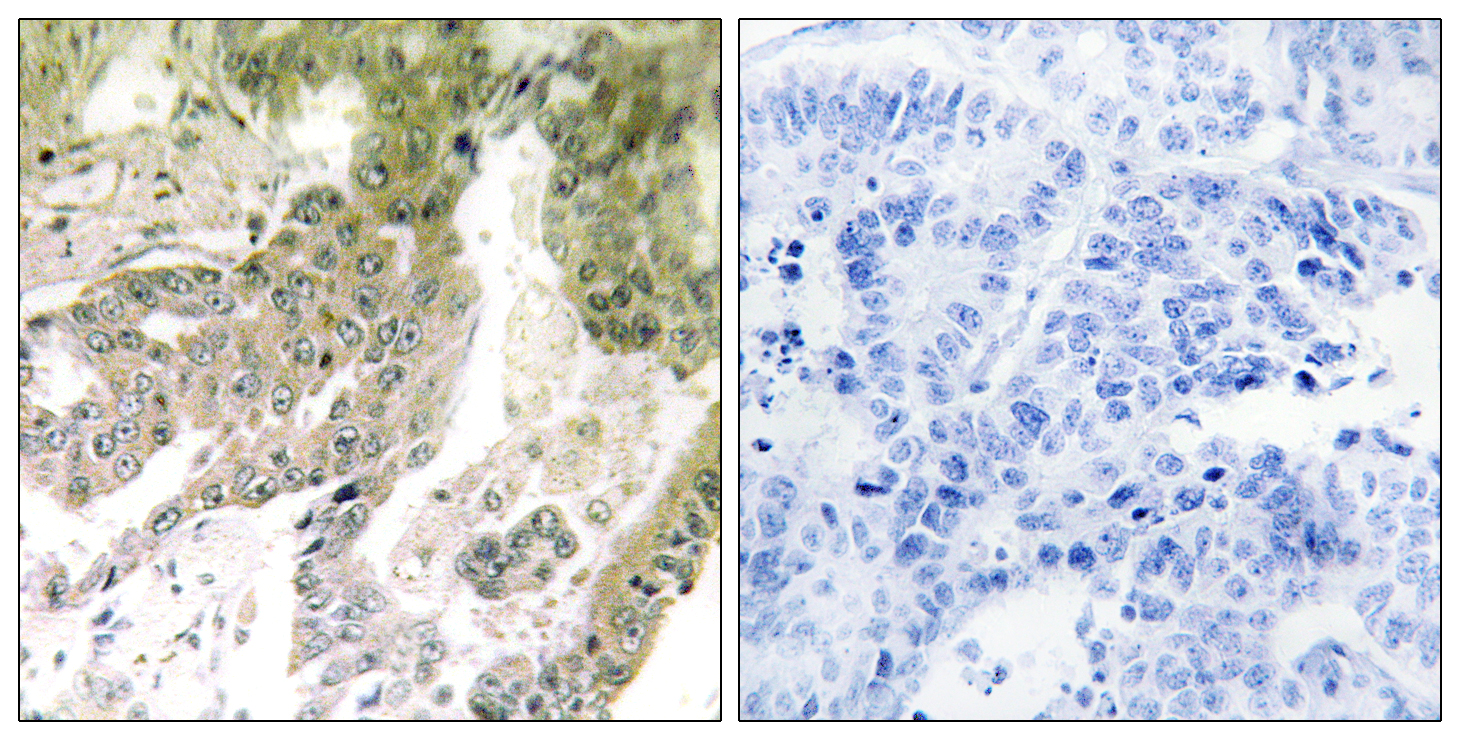 Immunohistochemistry analysis of paraffin-embedded Human lung carcinoma tissue, using LAMA5 antibody.High-pressure and temperature Sodium Citrate pH 6.0 was used for antigen retrieval. Sample with blocking peptide on the right.