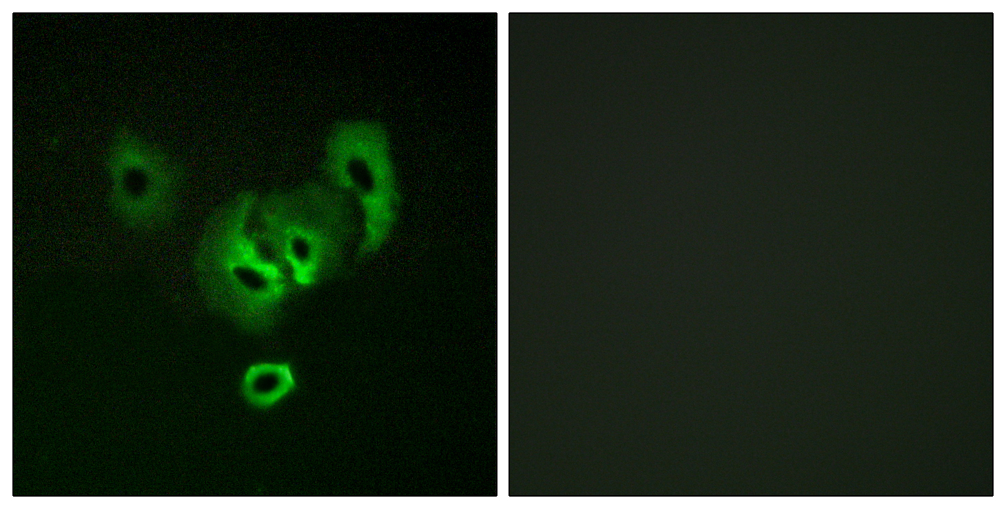 Immunofluorescence analysis of STEAP2 in A549 cells using STEAP2 antibody. Sample with blocking peptide on the right.