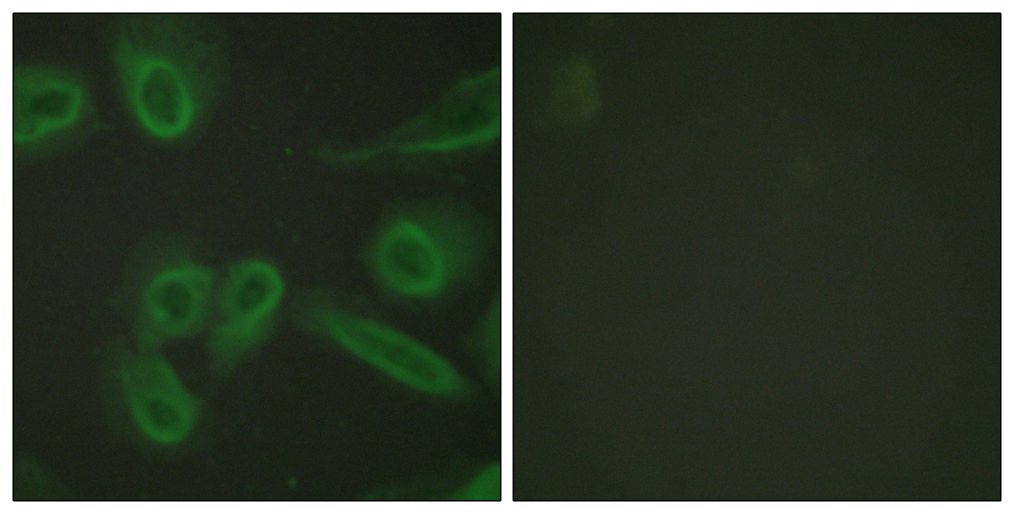 Immunofluorescence analysis of CD31 in HeLa using CD31 antibody. The picture on the right is blocked using synthesized peptide.