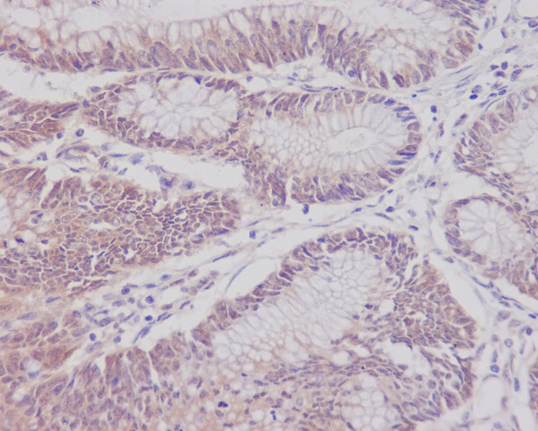 Immunohistochemistry analysis of paraffin-embedded Human colon cancer using CD3 epsilon antibody.High-pressure and temperature Sodium Citrate pH 6.0 was used for antigen retrieval.