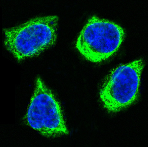 Immunofluorescence analysis of Cytochrome C in Hela using Cytochrome C antibody.