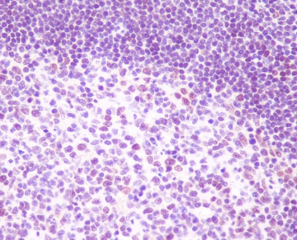 Immunohistochemistry analysis of paraffin-embedded Human tonsil using RelB antibody.High-pressure and temperature Sodium Citrate pH 6.0 was used for antigen retrieval.