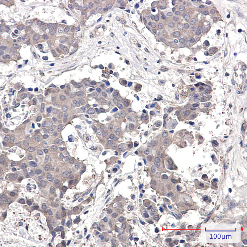 Immunohistochemistry analysis of paraffin-embedded Human breast cancer using GRK3 antibody.High-pressure and temperature Sodium Citrate pH 6.0 was used for antigen retrieval.