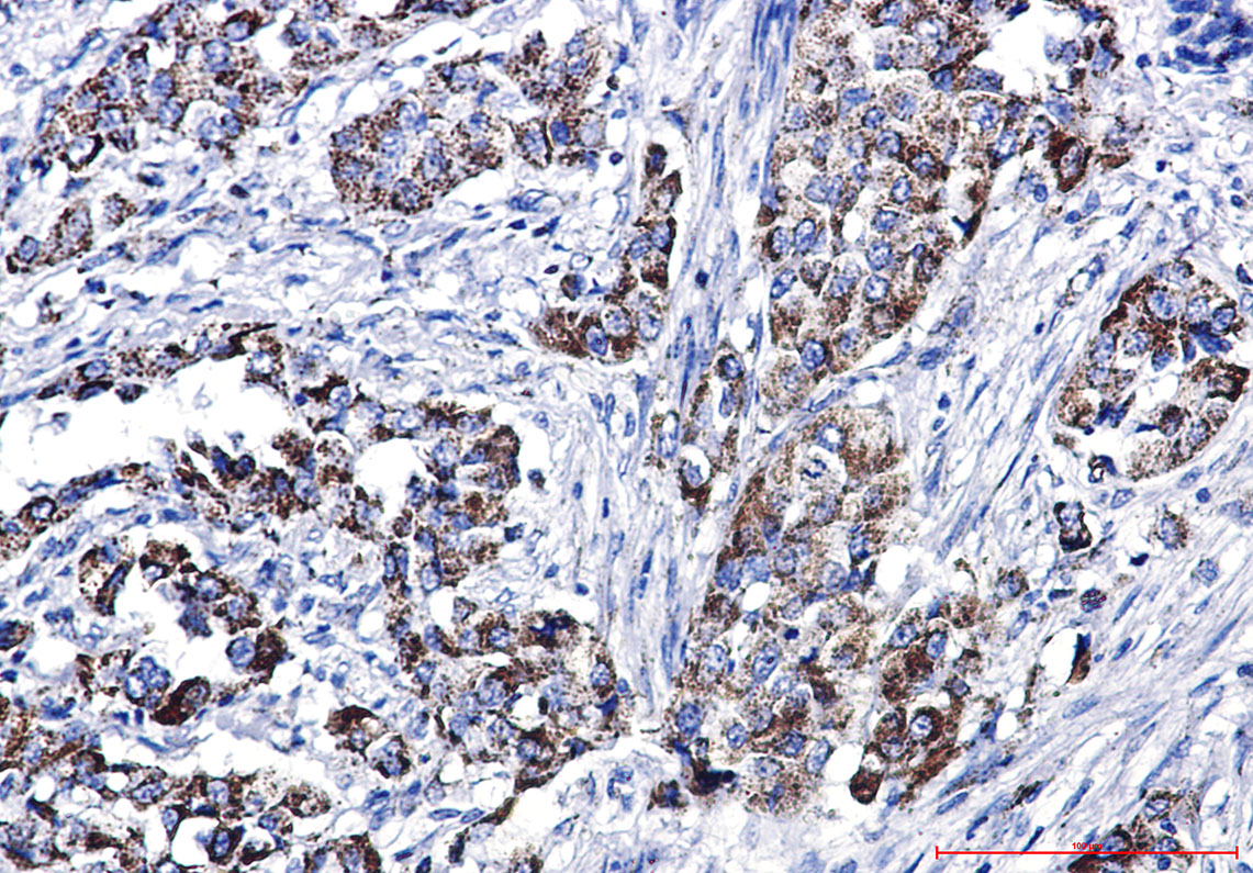 Immunohistochemistry analysis of paraffin-embedded Human lung cancer using Glutaminase antibody.High-pressure and temperature Sodium Citrate pH 6.0 was used for antigen retrieval.