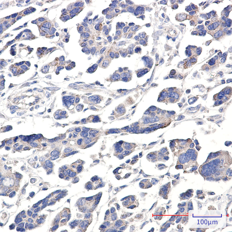 Immunohistochemistry analysis of paraffin-embedded Human Cholangiocarcinoma using APG5L/ATG5 antibody.High-pressure and temperature Sodium Citrate pH 6.0 was used for antigen retrieval.