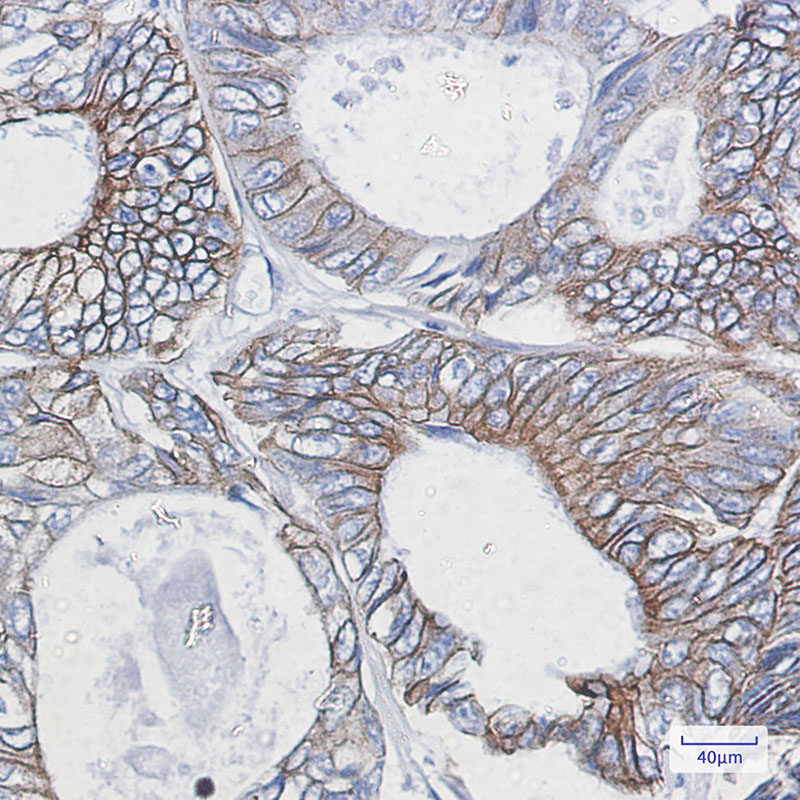 Immunohistochemistry analysis of paraffin-embedded Human colon cancer using Cytokeratin 18 antibody.High-pressure and temperature Sodium Citrate pH 6.0 was used for antigen retrieval.