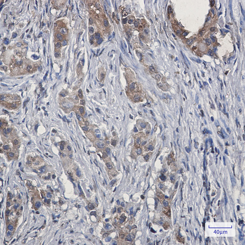 Immunohistochemistry analysis of paraffin-embedded Human lung cancer using Ezrin antibody.High-pressure and temperature Sodium Citrate pH 6.0 was used for antigen retrieval.