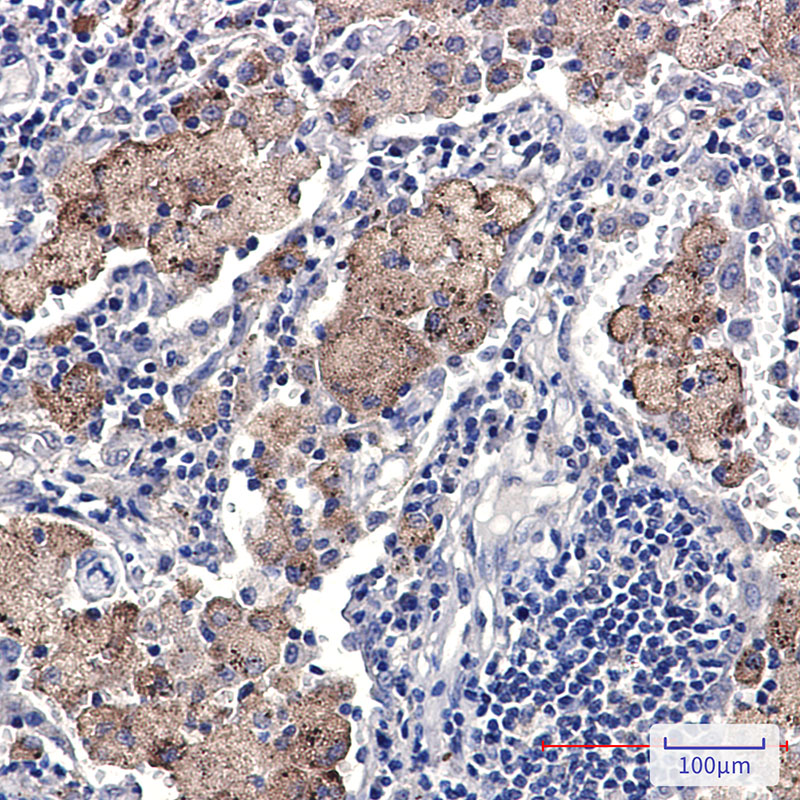 Immunohistochemistry analysis of paraffin-embedded Human lung cancer using Gemin 1 antibody.High-pressure and temperature Sodium Citrate pH 6.0 was used for antigen retrieval.