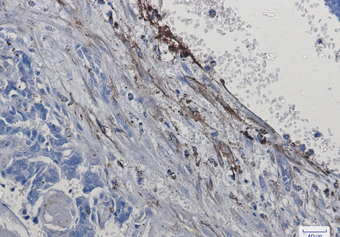 Immunohistochemistry analysis of paraffin-embedded Human breast cancer using Integrin alpha 5 antibody.High-pressure and temperature Sodium Citrate pH 6.0 was used for antigen retrieval.