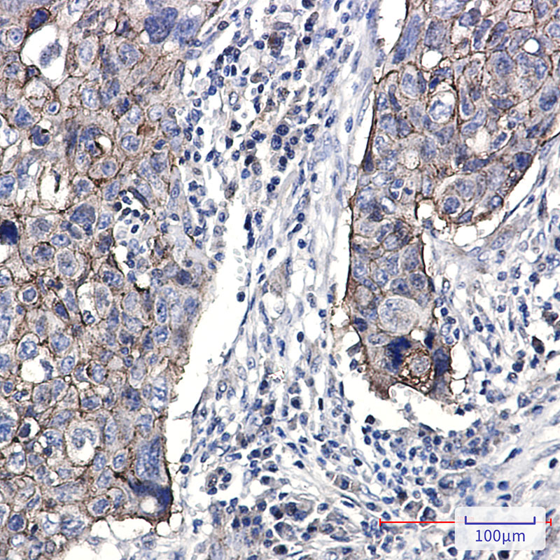 Immunohistochemistry analysis of paraffin-embedded Human lung cancer using Junctional Adhesion Molecule 1 antibody.High-pressure and temperature Sodium Citrate pH 6.0 was used for antigen retrieval.