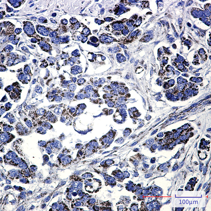 Immunohistochemistry analysis of paraffin-embedded Human Cholangiocarcinoma using Methylmalonyl Coenzyme A mutase antibody.High-pressure and temperature Sodium Citrate pH 6.0 was used for antigen retrieval.