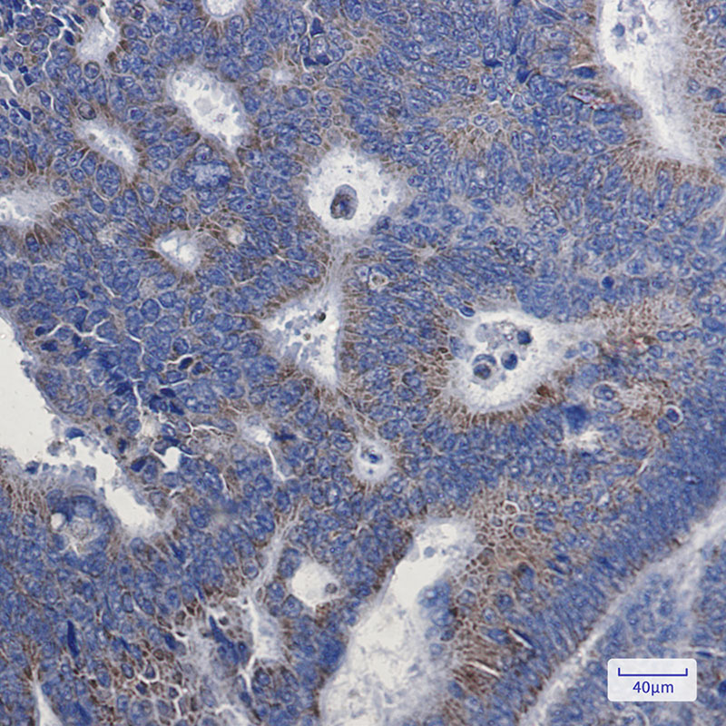 Immunohistochemistry analysis of paraffin-embedded Human colon cancer using NDUFA1 antibody.High-pressure and temperature Sodium Citrate pH 6.0 was used for antigen retrieval.
