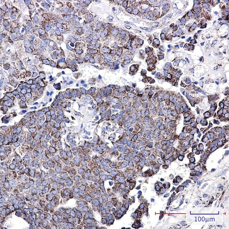 Immunohistochemistry analysis of paraffin-embedded Human breast cancer using NDUFC2 antibody.High-pressure and temperature Sodium Citrate pH 6.0 was used for antigen retrieval.