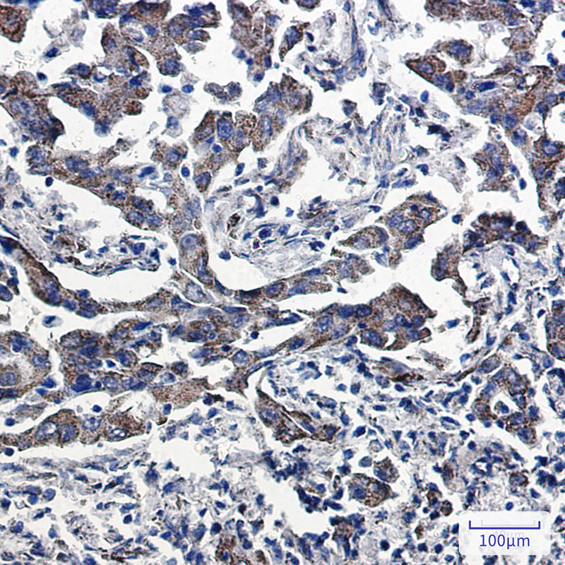 Immunohistochemistry analysis of paraffin-embedded Human lung cancer using Peroxiredoxin 5 antibody.High-pressure and temperature Sodium Citrate pH 6.0 was used for antigen retrieval.