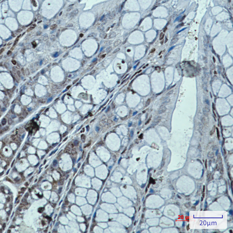 Immunohistochemistry analysis of paraffin-embedded mouse colon using RUNX antibody.High-pressure and temperature Sodium Citrate pH 6.0 was used for antigen retrieval.