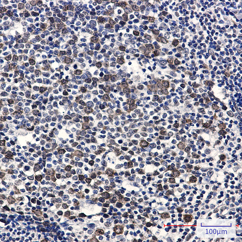 Immunohistochemistry analysis of paraffin-embedded Human tonsil using Cdk2 antibody.High-pressure and temperature Sodium Citrate pH 6.0 was used for antigen retrieval.