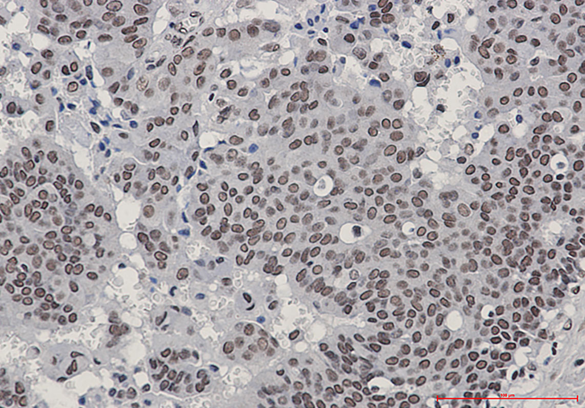 Immunohistochemistry analysis of paraffin-embedded Human breast cancer using HSF1 antibody.High-pressure and temperature Sodium Citrate pH 6.0 was used for antigen retrieval.