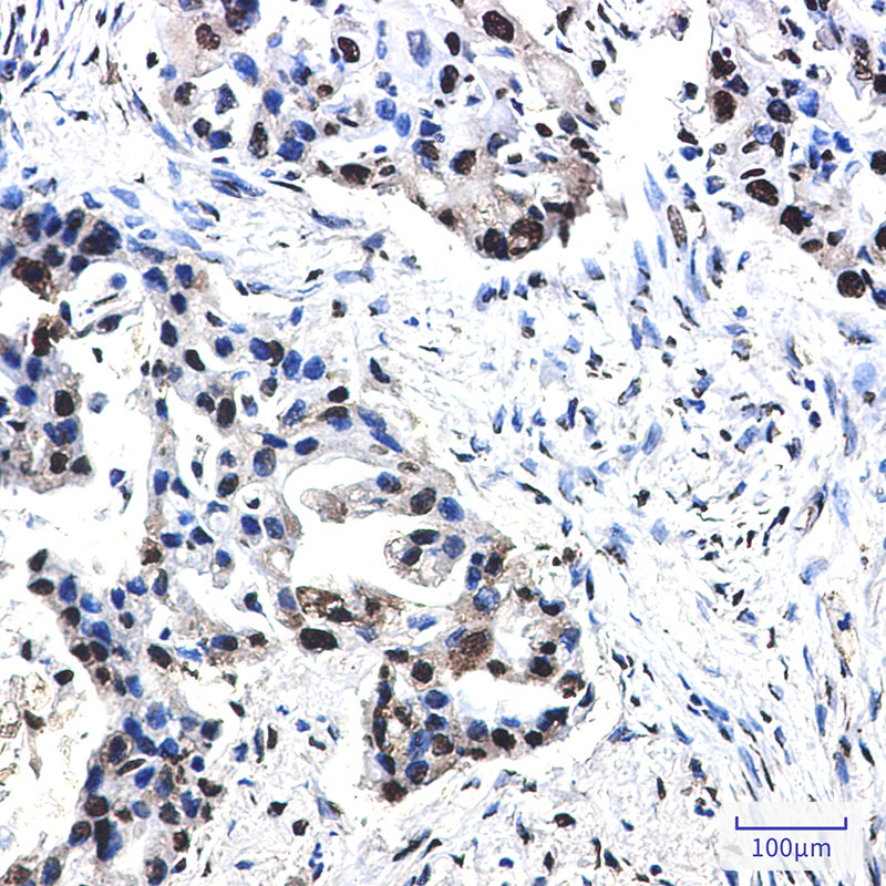 Immunohistochemistry analysis of paraffin-embedded Human lung cancer using Nucleophosmin antibody.High-pressure and temperature Sodium Citrate pH 6.0 was used for antigen retrieval.