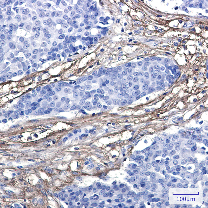 Immunohistochemistry analysis of paraffin-embedded Human breast cancer using EFEMP1/Fibulin3 antibody.High-pressure and temperature Sodium Citrate pH 6.0 was used for antigen retrieval.