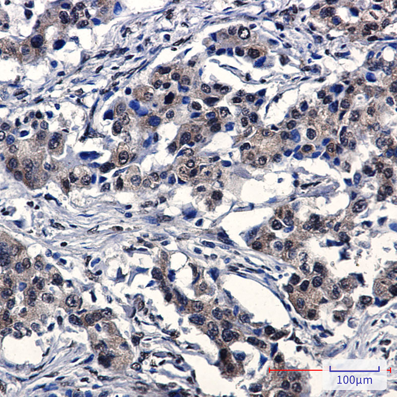 Immunohistochemistry analysis of paraffin-embedded Human lung cancer using IRF3 antibody.High-pressure and temperature Sodium Citrate pH 6.0 was used for antigen retrieval.