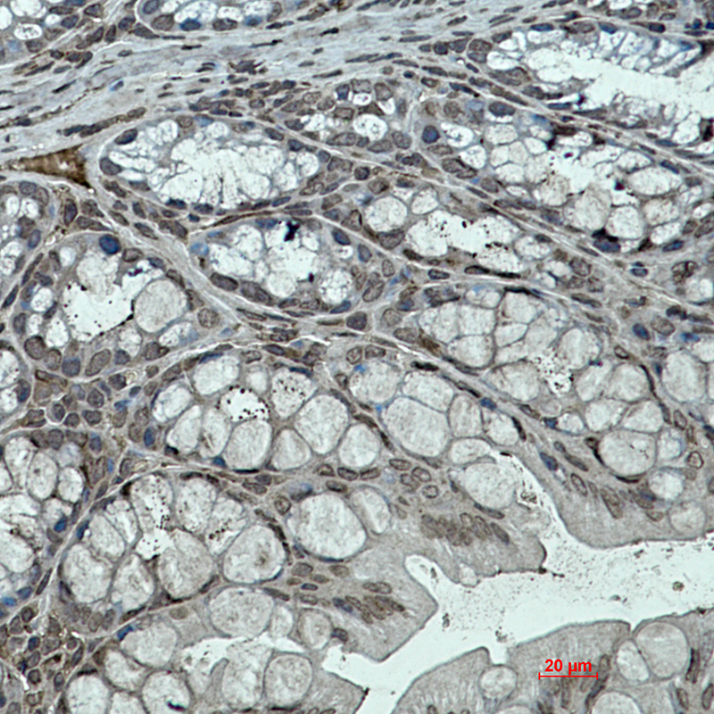 Immunohistochemistry analysis of paraffin-embedded mouse colon using KLF4 antibody.High-pressure and temperature Sodium Citrate pH 6.0 was used for antigen retrieval.