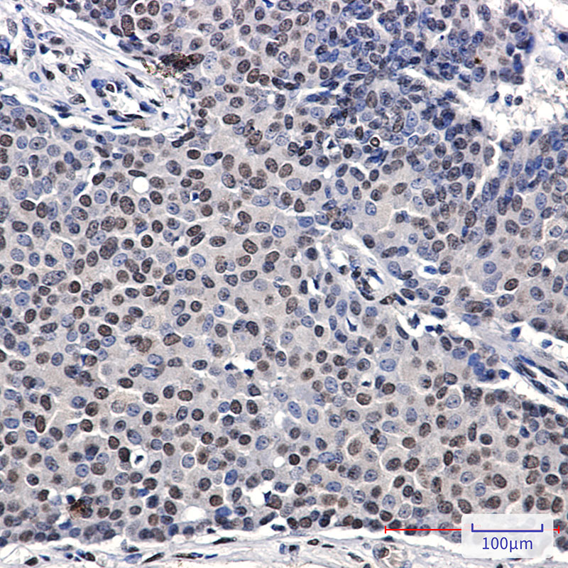 Immunohistochemistry analysis of paraffin-embedded Human breast cancer using p57 Kip2 antibody.High-pressure and temperature Sodium Citrate pH 6.0 was used for antigen retrieval.