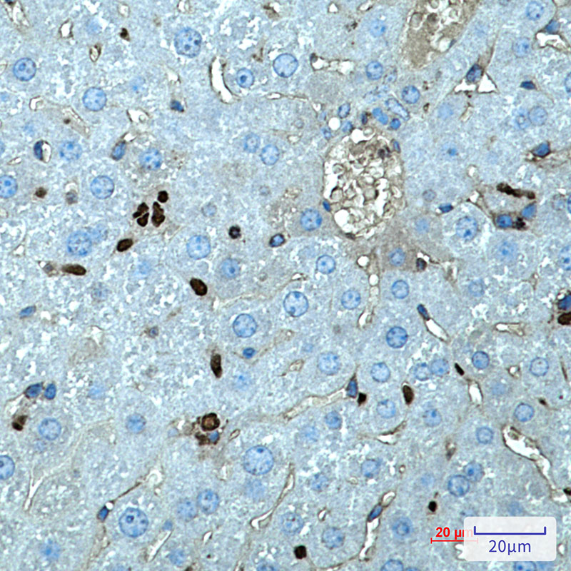Immunohistochemistry analysis of paraffin-embedded mouse liver using SPI1 antibody.High-pressure and temperature Sodium Citrate pH 6.0 was used for antigen retrieval.