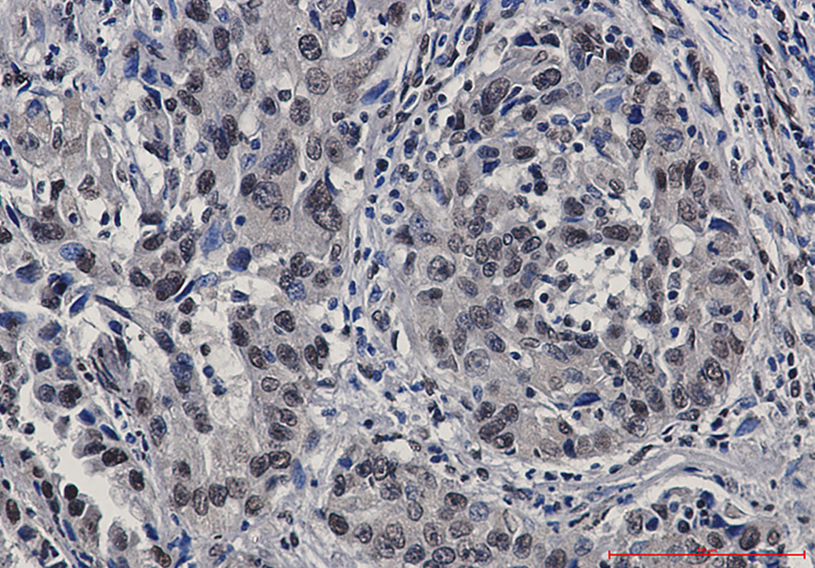 Immunohistochemistry analysis of paraffin-embedded Human lung cancer using STAT4 antibody.High-pressure and temperature Sodium Citrate pH 6.0 was used for antigen retrieval.