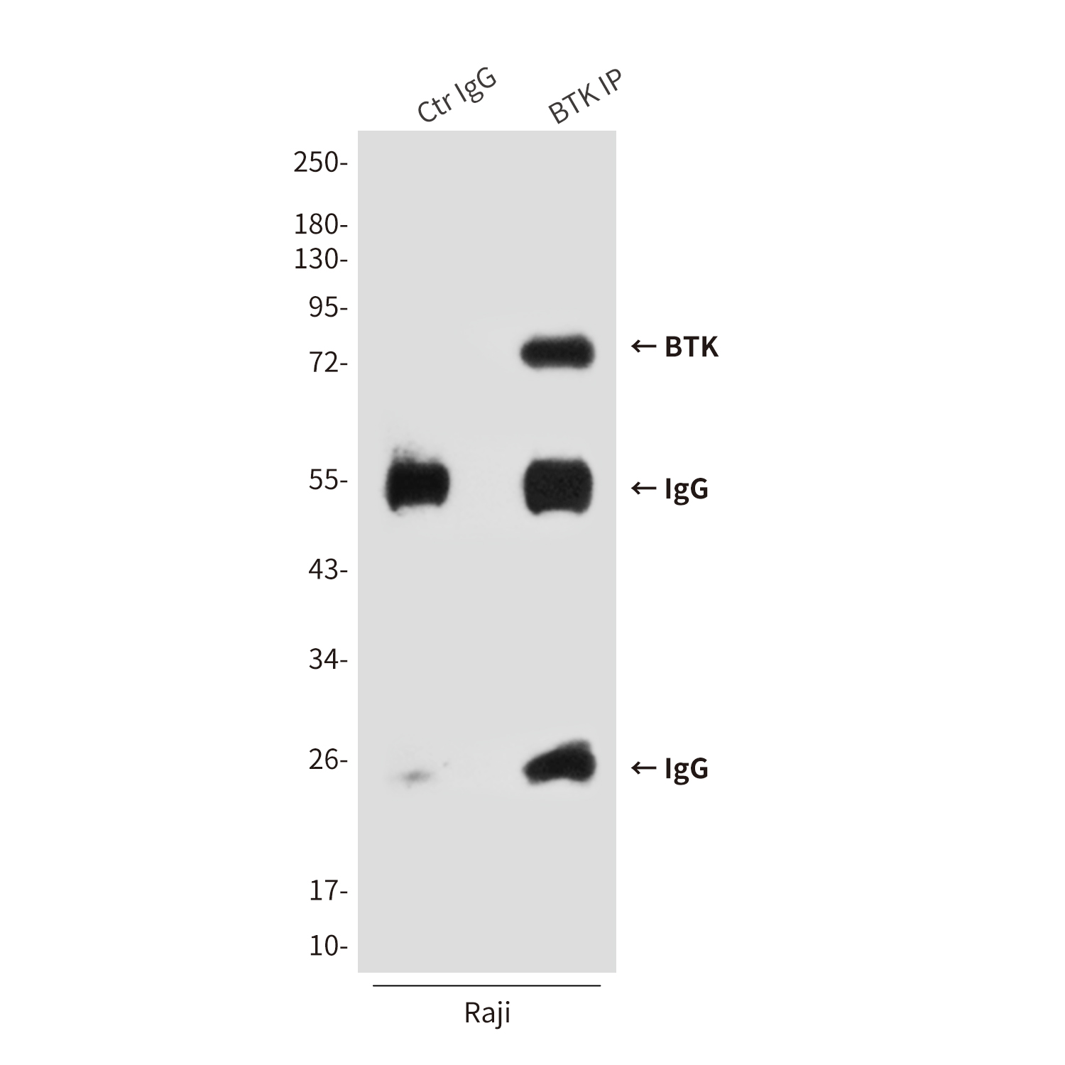 Immunoprecipitation analysis of BTK in Raji lysates using BTK antibody.