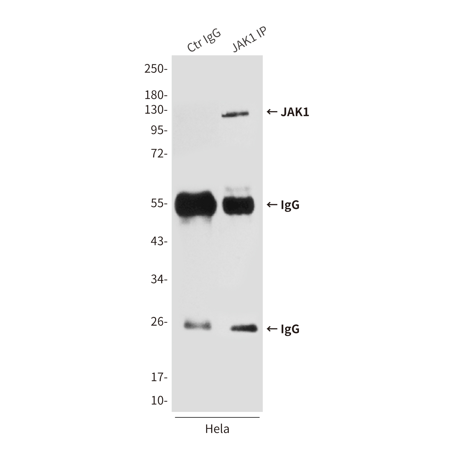 Immunoprecipitation analysis of JAK1 in Hela lysates using Jak1 antibody.