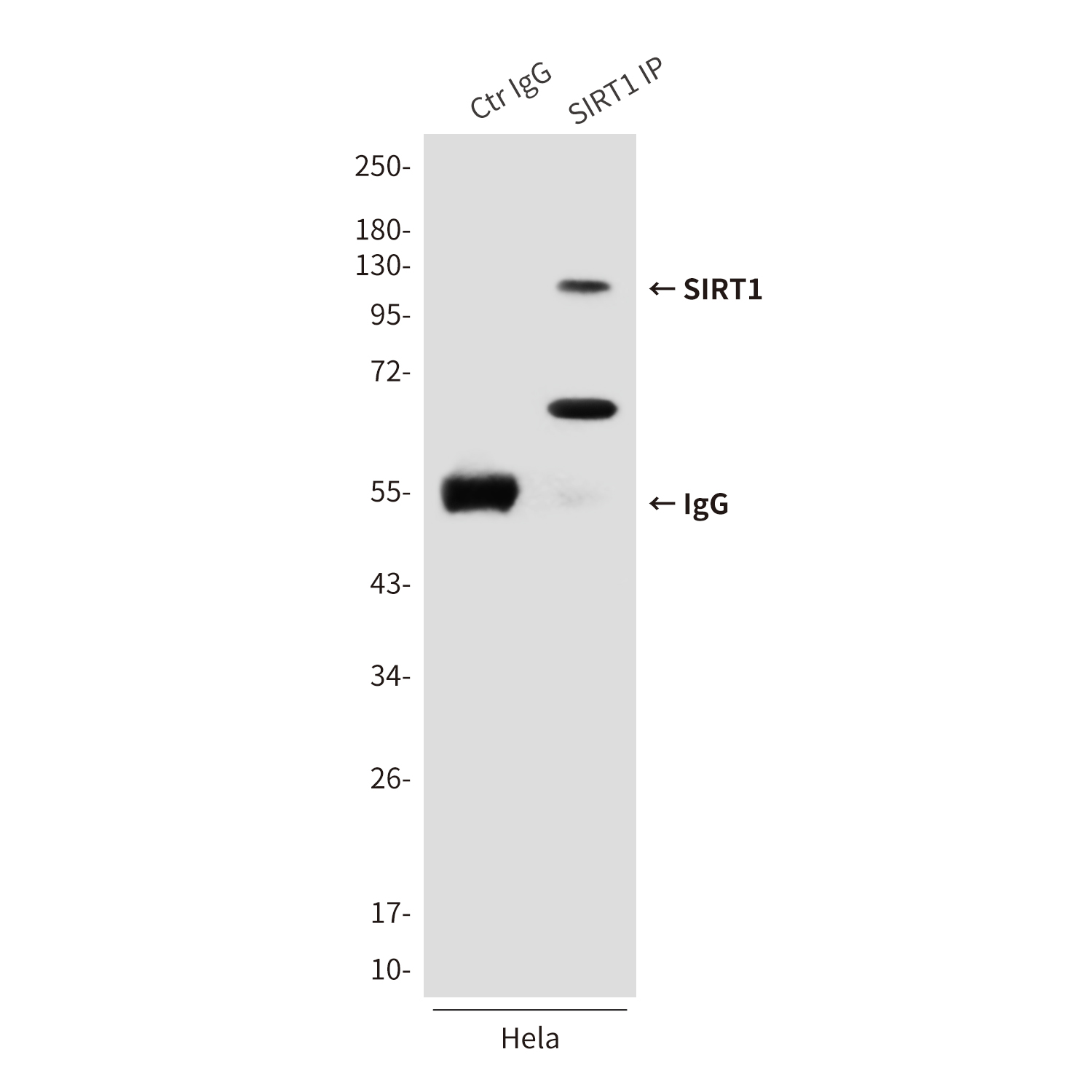 Immunoprecipitation analysis of SIRT1 in Hela lysates using SIRT1 antibody.