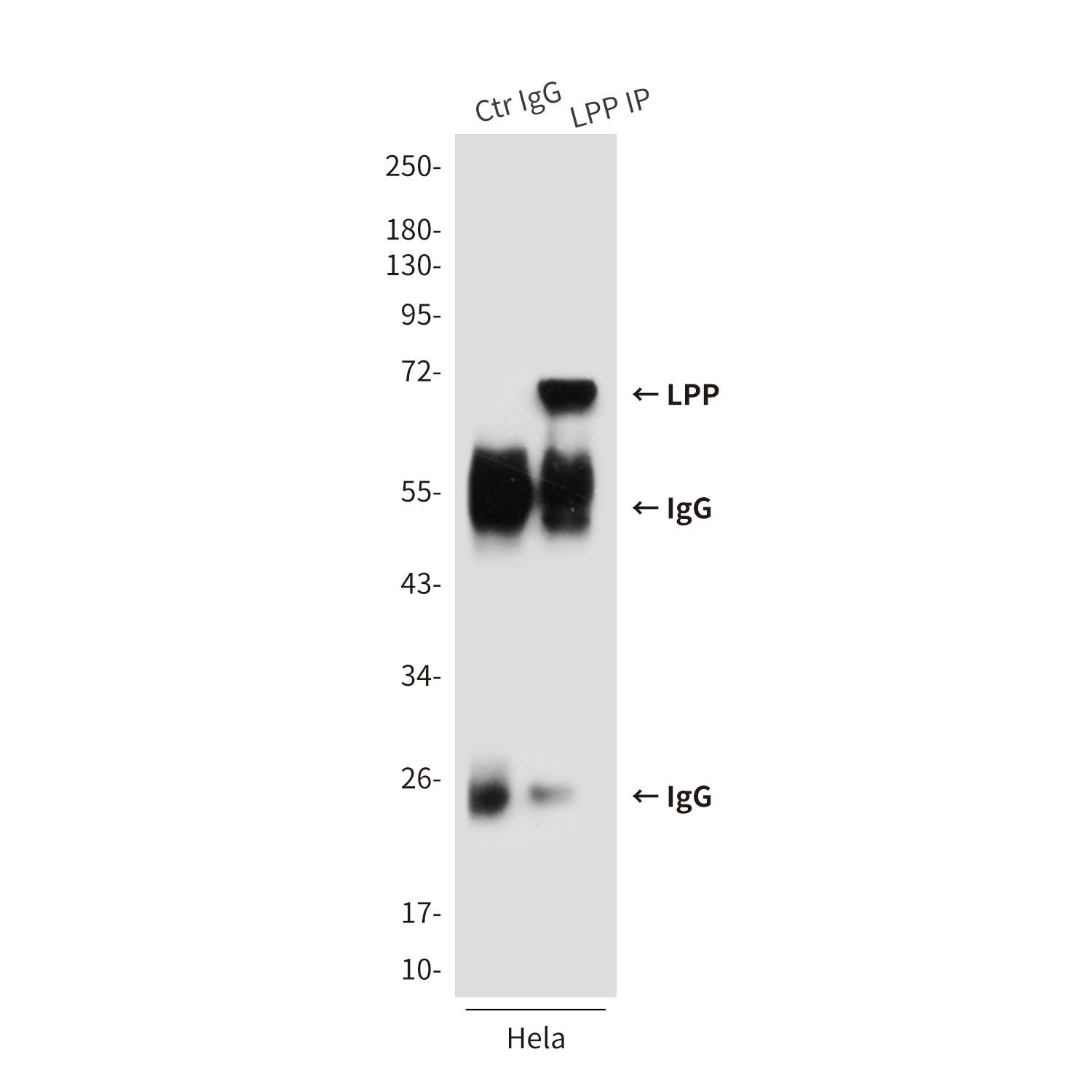 Immunofluorescence analysis of LPP in Hela cells using LPP antibody. Red: Actin filaments have been labeled using DY554 phalloidin,and DAPI .DRAQ5 fluorescent DNA dye.