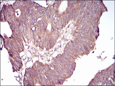 Immunohistochemistry analysis of paraffin-embedded rectum cancer tissues using GSK3B antibody with DAB staining.High-pressure and temperature Sodium Citrate pH 6.0 was used for antigen retrieval.
