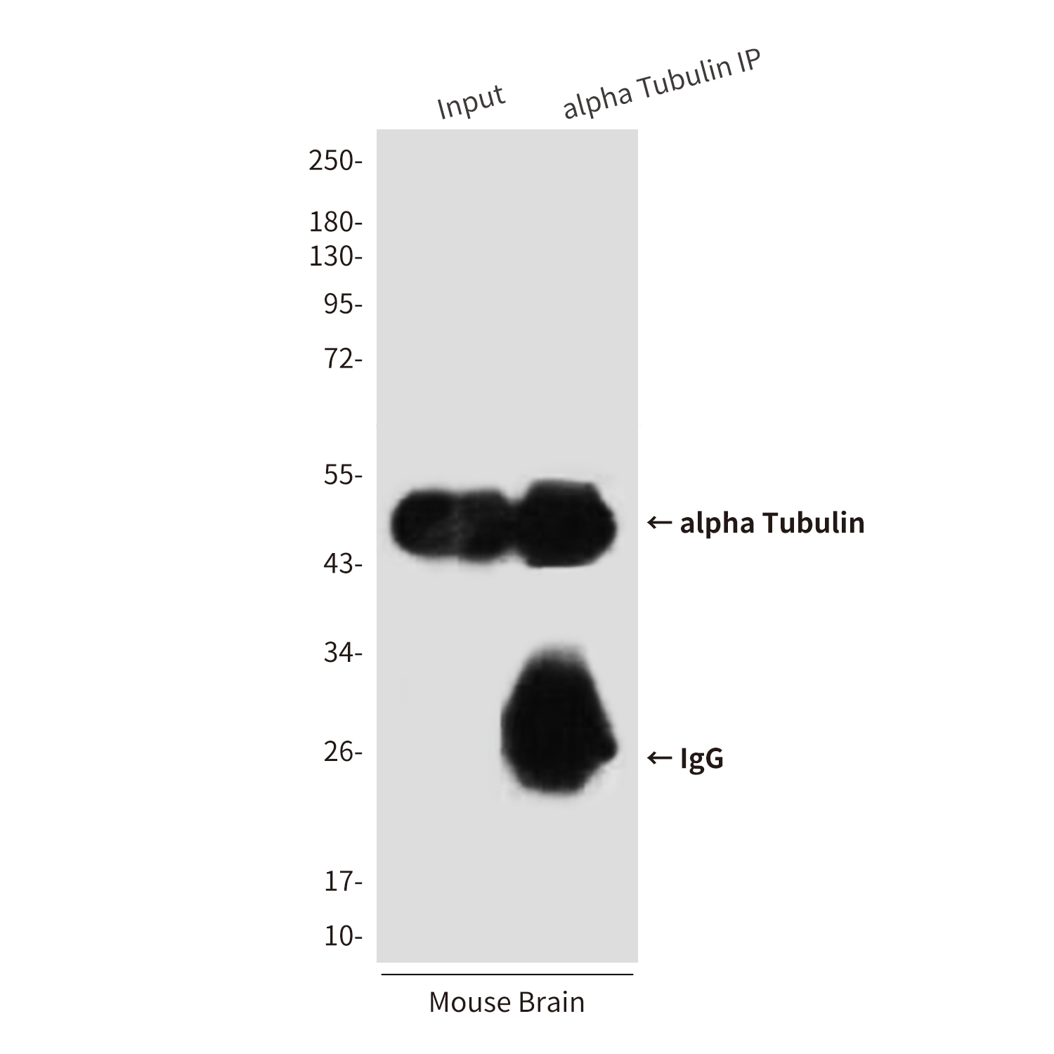 Immunoprecipitation analysis of alpha Tubulin in mouse Brain Tissue lysates using alpha Tubulin antibody.