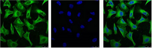 Immunofluorescence analysis of EGFR in Hela using EGFR antibody and DAPI .