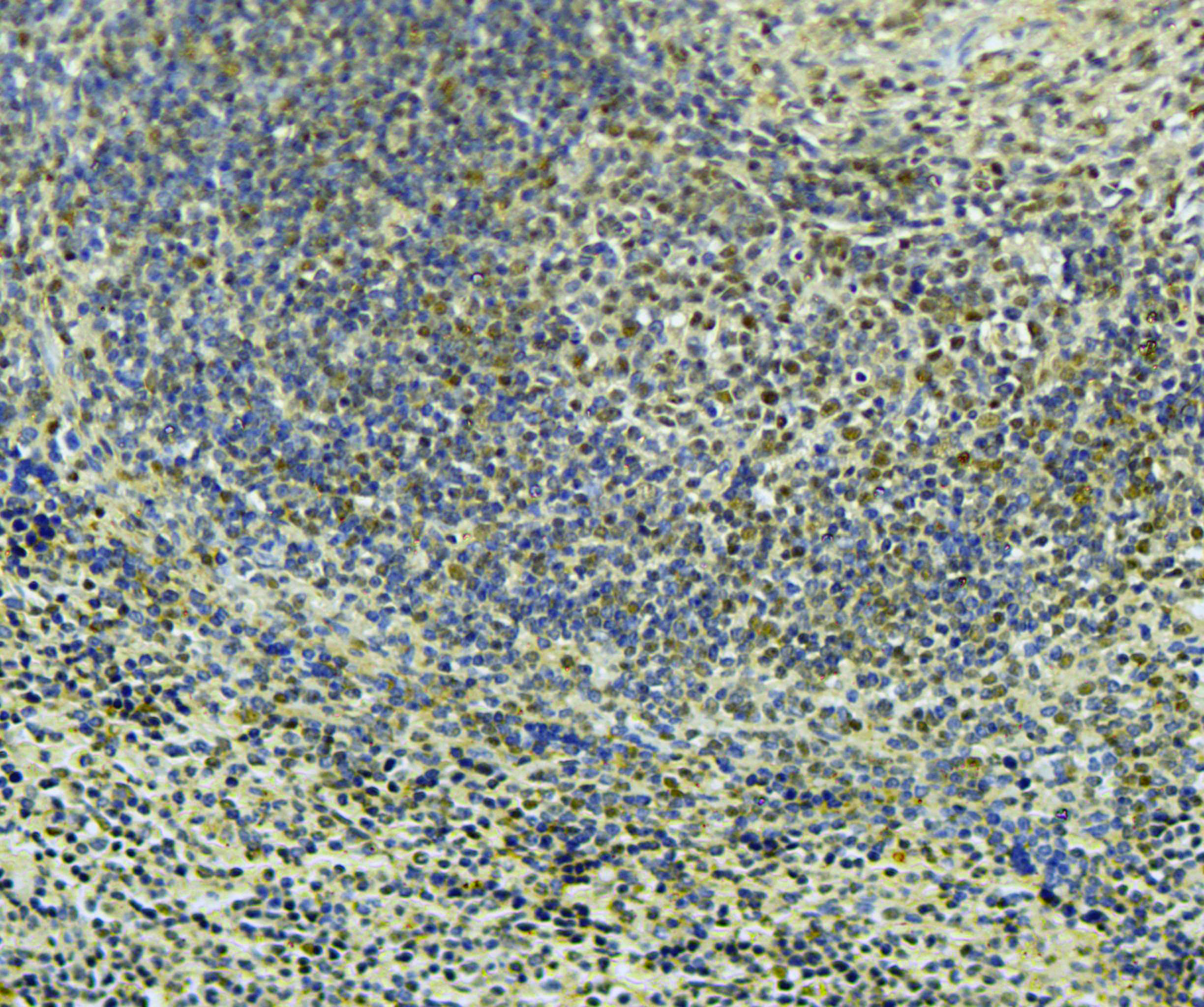 Immunohistochemistry (IHC) analyzes of ZNF706 pAb in paraffin-embedded mouse spleen tissue at 1:100.