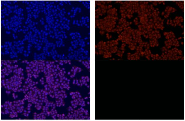 Immunofluorescence analysis of MCF-7 cells using ZNF706 pAb at dilution of 1:50 . Blue: DAPI for nuclear staining.