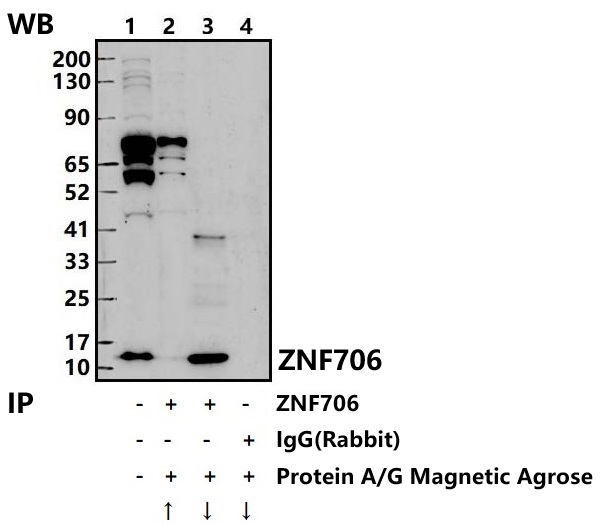 Immunoprecipitation of MCF-7 cell lysates using ZNF706 pAb (Magnetic agrose Bead Conjugate) #BD0082(lane 2 and lane 3) and Nonspecific IgG Control (Magnetic agrose Bead Conjugate)#BD0082 (lane 4) .Lane 1 is 30% input. The western blot was probed using ZNF706 pAb.“↑”(supernatant); “↓”(deposition)
