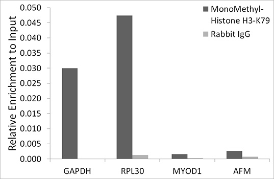 Chromatin immunoprecipitation analysis of extracts of HeLa cells, using MonoMethyl-Histone H3-K79 antibody and rabbit IgG.The amount of immunoprecipitated DNA was checked by quantitative PCR. Histogram was constructed by the ratios of the immunoprecipitated DNA to the input.