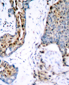 Immunohistochemistry of paraffin-embedded human breast carcinoma using Phospho-ESRα-S118 antibody .Perform microwave antigen retrieval with 10 mM Tris/EDTA buffer pH 9.0 before commencing with IHC staining protocol.