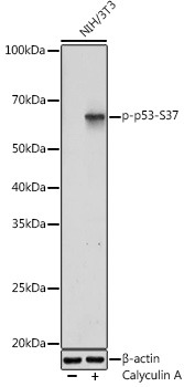 Western blot analysis of extracts of various cell lines, using Phospho-p53-S37 antibody at 1:1000 dilution.Both 293T cells and C6 cells were treated by Calyculin A at 37℃ for 30 minutes after serum-starvation overnight.
