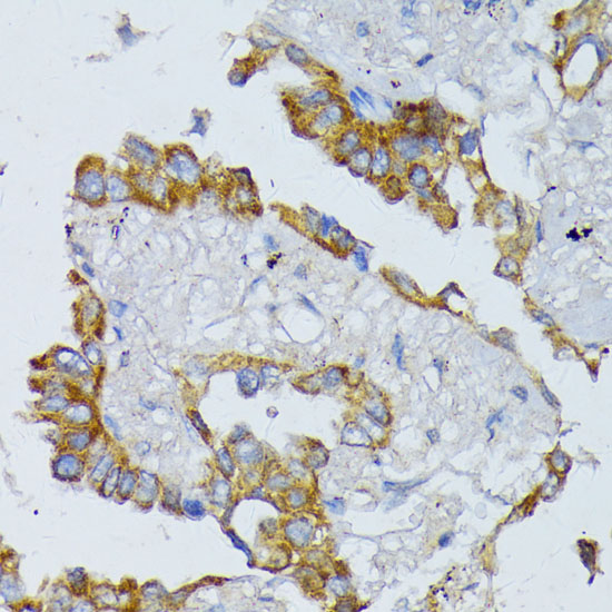 Immunohistochemistry of paraffin-embedded human liver cancer using Haptoglobin ) antibody at dilution of 1:100 .Perform microwave antigen retrieval with 10 mM PBS buffer pH 7.2 before commencing with IHC staining protocol.