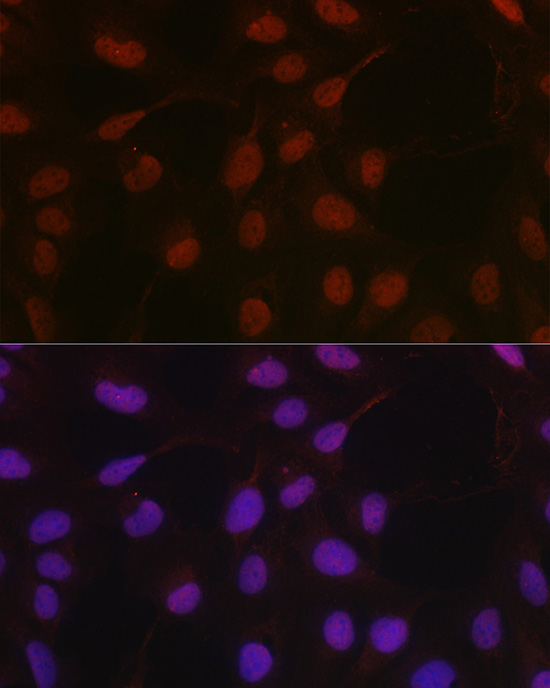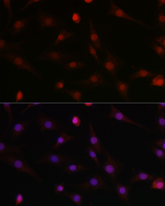 Immunofluorescence analysis of H9C2 cells using HIF1β/ARNT Rabbit pAb at dilution of 1:100 . Blue: DAPI for nuclear staining.