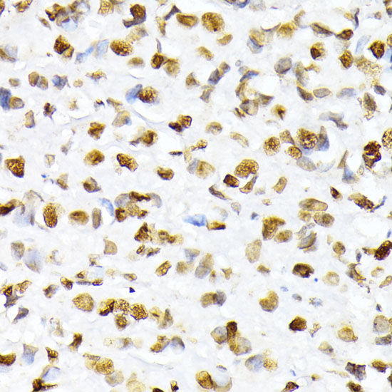 Immunohistochemistry of paraffin-embedded human breast cancer using Phospho-Histone H2A-S129 antibody at dilution of 1:100 .Perform microwave antigen retrieval with 10 mM Tris/EDTA buffer pH 9.0 before commencing with IHC staining protocol.