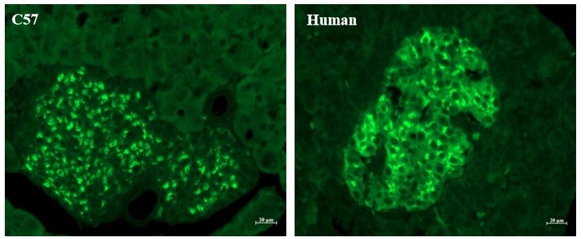Immunohistochemical analysis of Human Proinsulin (3L10) staining in Mouse pancreas and human pancreas tissue section.
