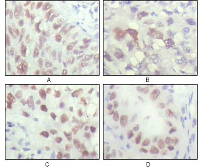 Immunohistochemical analysis of paraffin-embedded human lung carcinoma (A), liver carcinoma (B), breast carcinoma (C) and kiney carcinoma (D), showing nuclear localization with DAB staining using CHK2 mouse mAb.