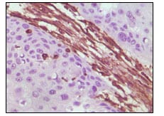 Background :Vimentin, also know as VIM. It is the major subunit protein of the intermediate filaments of mesenchymal cells. It is believed to be involved with the intracellular transport of proteins between the nucleus and plasma membrane. Vimentin has been implicated to be involved in the rate of steroid synthesis via its role as a storage network for steroidogenic cholesterol containing lipid droplets. Vimentin phosphorylation by a protein kinase causes the breakdown of intermediate filaments and activation of an ATP and myosin light chain dependent contractile event. This results in cytoskeletal changes that facilitate the interaction of the lipid droplets within mitochondria, and subsequent transport of cholesterol to the organelles leading to an increase in steroid synthesis. Immunohistochemical staining for Vimentin is characteristic of sarcomas (of neural, muscle and fibroblast origin) compared to carcinomas which are generally negative. Melanomas, lymphomas and vascular tumors may all stain for Vimentin. Vimentin antibodies are thus of value in the differential diagnosis of undifferentiated neoplasms and malignant tumors. They are generally used with a panel of other antibodies including those recognising cytokeratins, lymphoid markers, S100, desmin and neurofilaments.