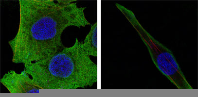 Confocal Immunofluorescence analysis of PANC-1 (left) and SKBR-3 (right) cells using SOD1 mouse mAb (green). Red: Actin filaments have been labeled with DY-554 phalloidin. Blue: DRAQ5 fluorescent DNA dye.