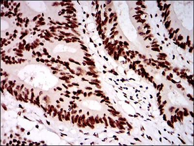 Immunohistochemical analysis of paraffin-embedded human colon cancer tissues using KIAA1967 mouse mAb with DAB staining.